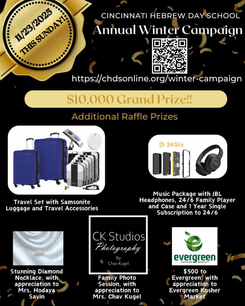00Days 00Hours 00Minutes 00Seconds Ticket Sales 387 Tickets Sold Donate Now for Your Chance To Win! Ticket Sales Alternate Donation Ticket Sales Cincinnati Hebrew Day SchoolWinter Campaign customer_name email Choose an amount $150.00 Phone (optional) Solicitor Amount of Tickets I will cover the processing fee (optional) Subtotal $150.00 Processing fee $0.00 Total Amount: $150.00 Please Wait… Alternate Donation Cincinnati Hebrew Day SchoolDonation customer_name Phone (optional) email Choose an amount starting at $5.00 Amount $ Notes/Solicitor I will cover the processing fee (optional) Subtotal $5.00 Processing fee $0.00 Total due $5.00 Please Wait…